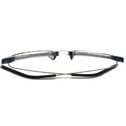 Se trata de una gafa de policarbonato de forma rectangular con lentes acrílicas, de corte clásico y sencillo. La parte exterior de la montura es de color negro, combinado con el azul intenso de la cara interna, toda ella con efecto mate. Ambas varillas con flexibles, aportando comodidad a la gafa.