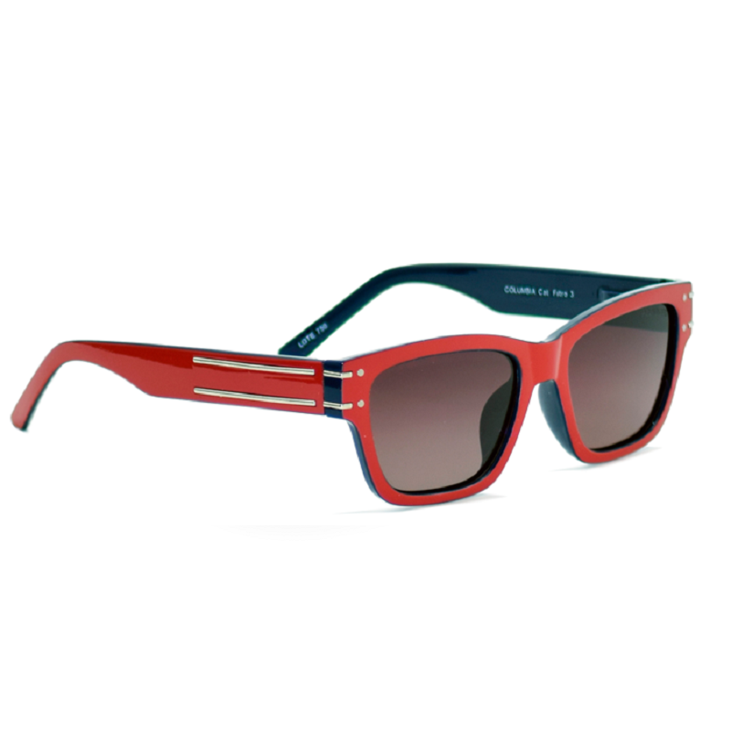 Gafa de Sol femenina con frontal wayfarer y montura en acabado rojo brillo e interior azul marino. Con unos elegantes detalles metálicos, en forma de líneas que abrazan la varilla hasta el frontal. De tamaño pequeño y apertura flexible. La Gafa Columbia es una gafa muy cómoda e ideal para cualquier look desenfadado aportando un toque muy elegante.
