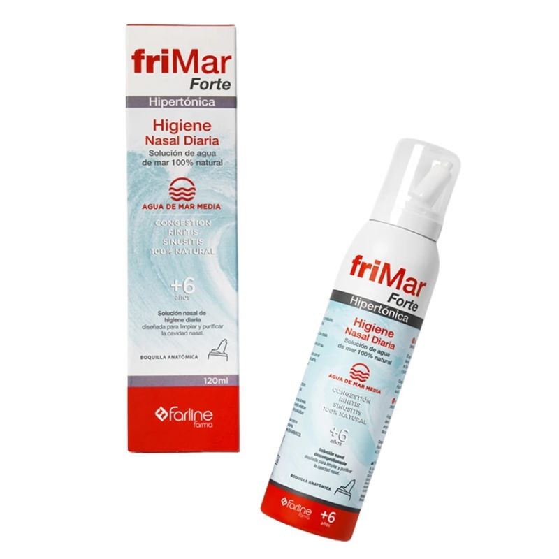 Frimar Forte Hipertónico es una solución de agua de mar 100 % natural con concentración hipertónica, diseñada para descongestionar, limpiar y purificar la cavidad nasal de forma eficaz. Está especialmente indicada en casos de congestión nasal intensa, rinitis o sinusitis, ya que ayuda a reducir el edema de la mucosa nasal y favorece la eliminación del exceso de mucosidad.