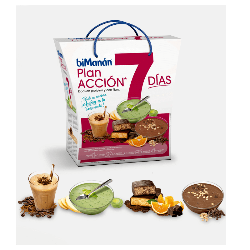 Es un plan que combina productos Bimanán con alimentos de la dieta mediterránea. El kit incluye los productos necesarios para realizar el plan durante 7 días