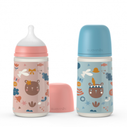Biberón de boca ancha con fórma ergónomica y tetina que imita la forma del pezón materno durante la succión.