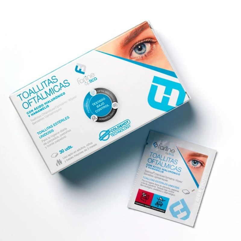 Toallitas oftálmicas estériles para la higiene diaria de párpados, pestañas y borde palpebral.