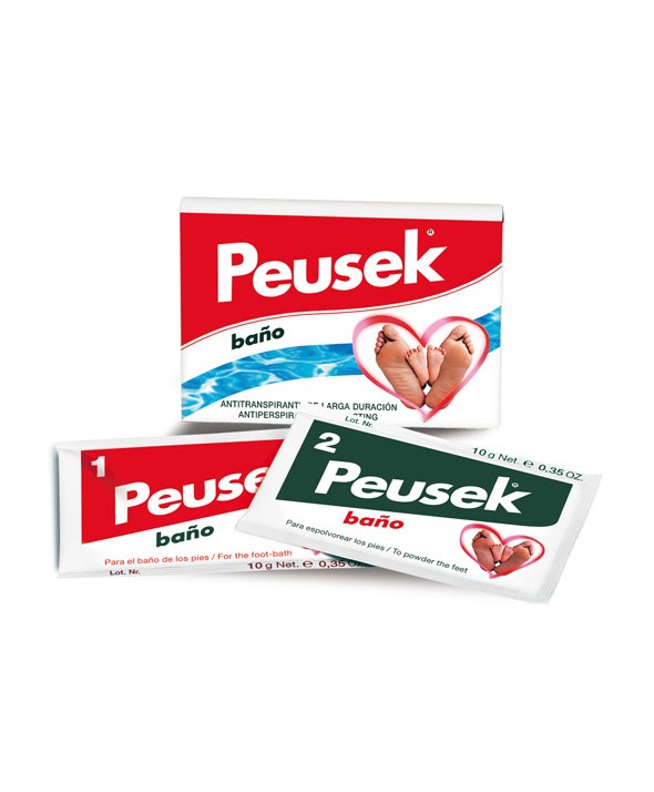 En los pies tenemos 600 glándulas sudoríparas por cm² El sudor está compuesto por casi un 99% de agua, donde hay disueltas sustancias como sales, urea o ácido láctico. Su descomposición es la causante del mal olor. El exceso de sudor procedente de las glándulas se puede regular, eliminando también el mal olor, con productos especializados: PEUSEK-baño, PEUSEK-hydro y PEUSEK-SEK sport. Tratamiento Antitranspirante INDICACIONES: Controla el exceso de sudor y mal olor causado por su descomposición. Peusek-baño, corrige la sudoración excesiva de los pies, sin impedir su normal transpiración. MODO DE EMPLEO: Pediluvio con el contenido del sobre Nº 1, seguido de espolvoreado con el sobre Nº 2. Actúa con una sola aplicación con efectos de larga duración. PRESENTACIÓN: Estuche con dos sobres de polvo 2 x 10 g. En los pies tenemos 600 glándulas sudoríparas por cm² El sudor está compuesto por casi un 99% de agua, donde hay disueltas sustancias como sales, urea o ácido láctico. Su descomposición es la causante del mal olor. El exceso de sudor procedente de las glándulas se puede regular, eliminando también el mal olor, con productos especializados: PEUSEK-baño, PEUSEK-hydro y PEUSEK-SEK sport. Tratamiento Antitranspirante INDICACIONES: Controla el exceso de sudor y mal olor causado por su descomposición. Peusek-baño, corrige la sudoración excesiva de los pies, sin impedir su normal transpiración. MODO DE EMPLEO: Pediluvio con el contenido del sobre Nº 1, seguido de espolvoreado con el sobre Nº 2. Actúa con una sola aplicación con efectos de larga duración. PRESENTACIÓN: Estuche con dos sobres de polvo 2 x 10 g.