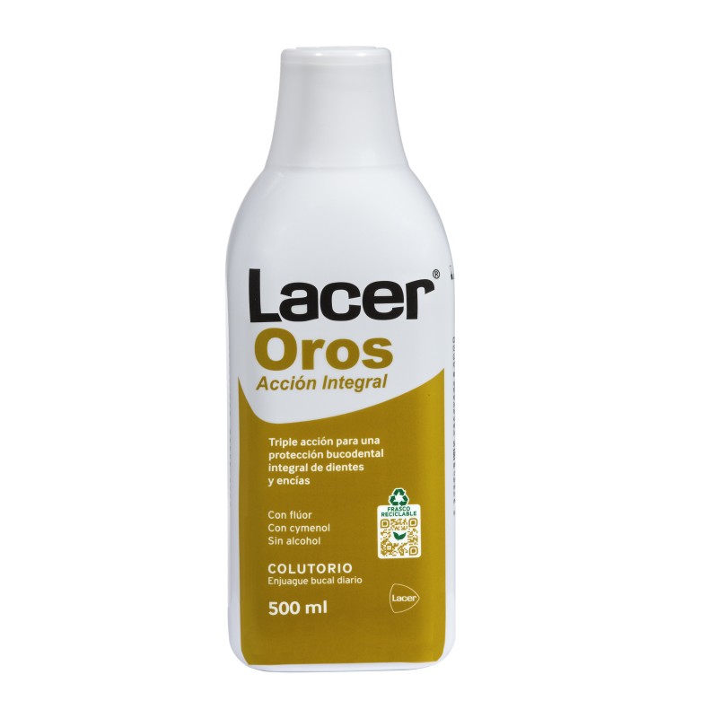 Lacer Oros Colutorio es un enjuague bucal que proporciona protección bucodental integral de dientes y encías, al tener una triple acción: previene el sangrado de encías, reduce la sensibilidad dental y protege contra la caries. El Flúor aportado en la formulación refuerza la estructura dental y remineraliza el esmalte. Incluye agentes revitalizantes gingivales que facilitan la regeneración epitelial, restableciendo el buen estado de las encías.