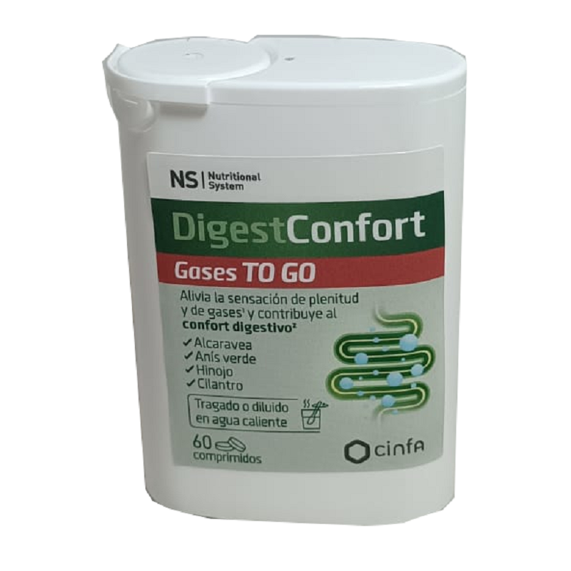 Ns Digesconfort gases esta formulado con aceites esenciales, los activos más eficaces en problemas digestivos, los cuales le proporcionan una doble acción: antiflatulento y antiespasmódico. Además es el único producto del mercado que presenta doble opción de toma, puede tomarlo en comprimidos o en infusión.
