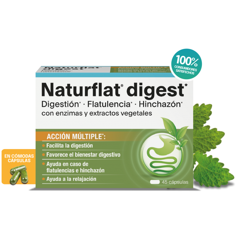 Naturflat digest, complemento alimenticio con una fórmula MULTIDIGESTIVA que posee el complejo enzimático Digezyme, combinado con extractos vegetales de melisa, menta e hinojo, con ACCIÓN MÚLTIPLE.