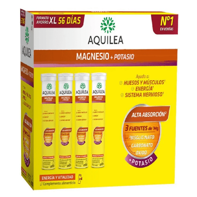 Aquilea Magnesio + Potasio contiene en cada comprimido la cantidad aconsejada de consumo diario de magnesio, por lo tanto, es un apoyo en la recuperación de energía y la reducción de los síntomas relacionados con la carencia de magnesio.