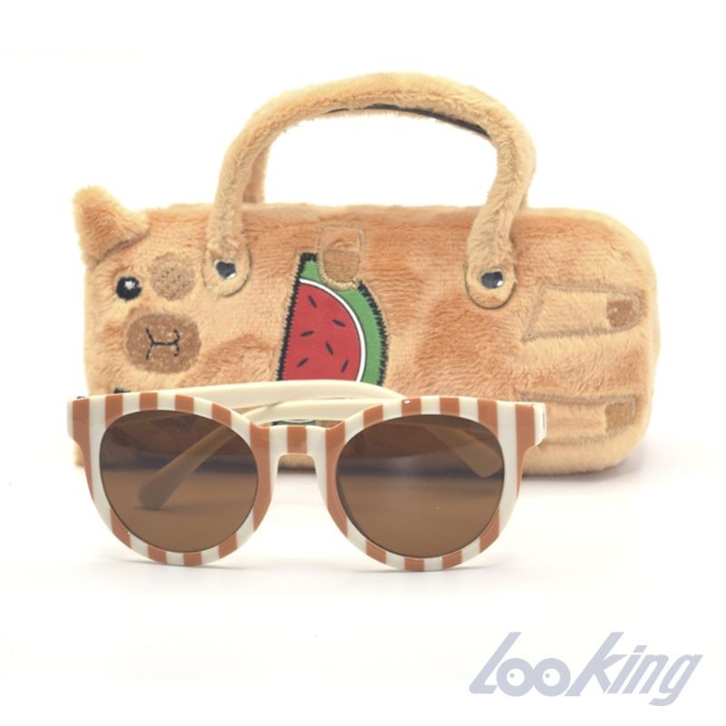 Las gafas de sol infantiles SHIRA combinan protección visual, comodidad y un diseño alegre pensado para los más pequeños. Presentan una montura redondeada con un encantador estampado de rayas en tonos arena y blanco, inspirado en el estilo veraniego de los años 60, ideal para aportar un toque divertido y actual.