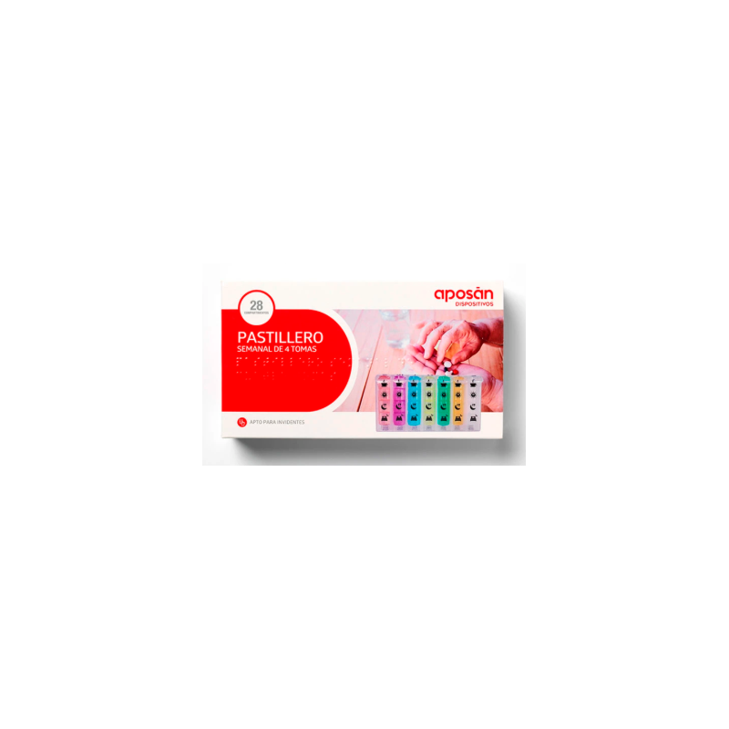 El pastillero semanal organiza la medicación en 4 tomas diarias, facilitando el control y evitando olvidos. Apto para personas invidentes